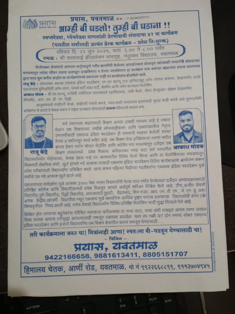 प्रयास एक विचार आहे समाजासाठी निस्वार्थीपणे काहीतरी काम करण्याचा. Recent Projects Have a look at what we do at Prayas Yavatmal: E waste Management E waste collection in Yavatmal कोरोना किट वाटप कोरोना किट वाटप धान्य गोळा करणे – दुर्गोत्सव धान्य गोळा करणे – दुर्गोत्सव Seed Ball निर्मिती Seed Ball Workshop with Children Seed Ball निर्मिती Seed ball Workshop With School Student Seed Ball निर्मिती Seed ball Workshop With college Student पाणी फाउंडेशन Water Cup Competition पाणी फाउंडेशन Barbada Village पाणी फाउंडेशन Barbada Village Shramadan मिशन हरितमाळ मिशन हरितमाळ मिशन हरितमाळ आम्ही बि घडलो, तुम्ही बि घडाना प्लास्टिक नियोजन व करीबॅग निर्मूलन अभियान प्लास्टिक नियोजन व करीबॅग निर्मूलन अभियान प्लास्टिक नियोजन व करीबॅग निर्मूलन अभियान प्रयासवाचनालय मिशन डीप निळोणा DCIM100GOPROG0019685. मिशन डीप निळोणा DCIM100GOPROG0049397. मिशन डीप निळोणा DCIM100GOPROG0038940. प्रयासवन Water body near prayasvan प्रयासवन Students visit प्रयासवन Prayas Niyantran kaksh प्रयासवन Shramadan@PARAYASVAN प्रयासवन Yoga@PARAYASVAN View All Photos Projects Have a look at what we do at Prayas Yavatmal: प्रयासवन मिशन डीप निळोणा प्रयासवाचनालय प्लास्टिक नियोजन व करीबॅग निर्मूलन अभियान आम्ही बि घडलो, तुम्ही बि घडाना Rain water harvesting एक मूठ धान्य पक्षांसाठी मिशन हरितमाळ पाणी फाउंडेशन बंधारा पुन:निर्माण - गोधणी रोड Zero waste मानजमेंट Seed Ball निर्मिती धान्य गोळा करणे – दुर्गोत्सव कोरोना किट वाटप इकोक्विज २०२३